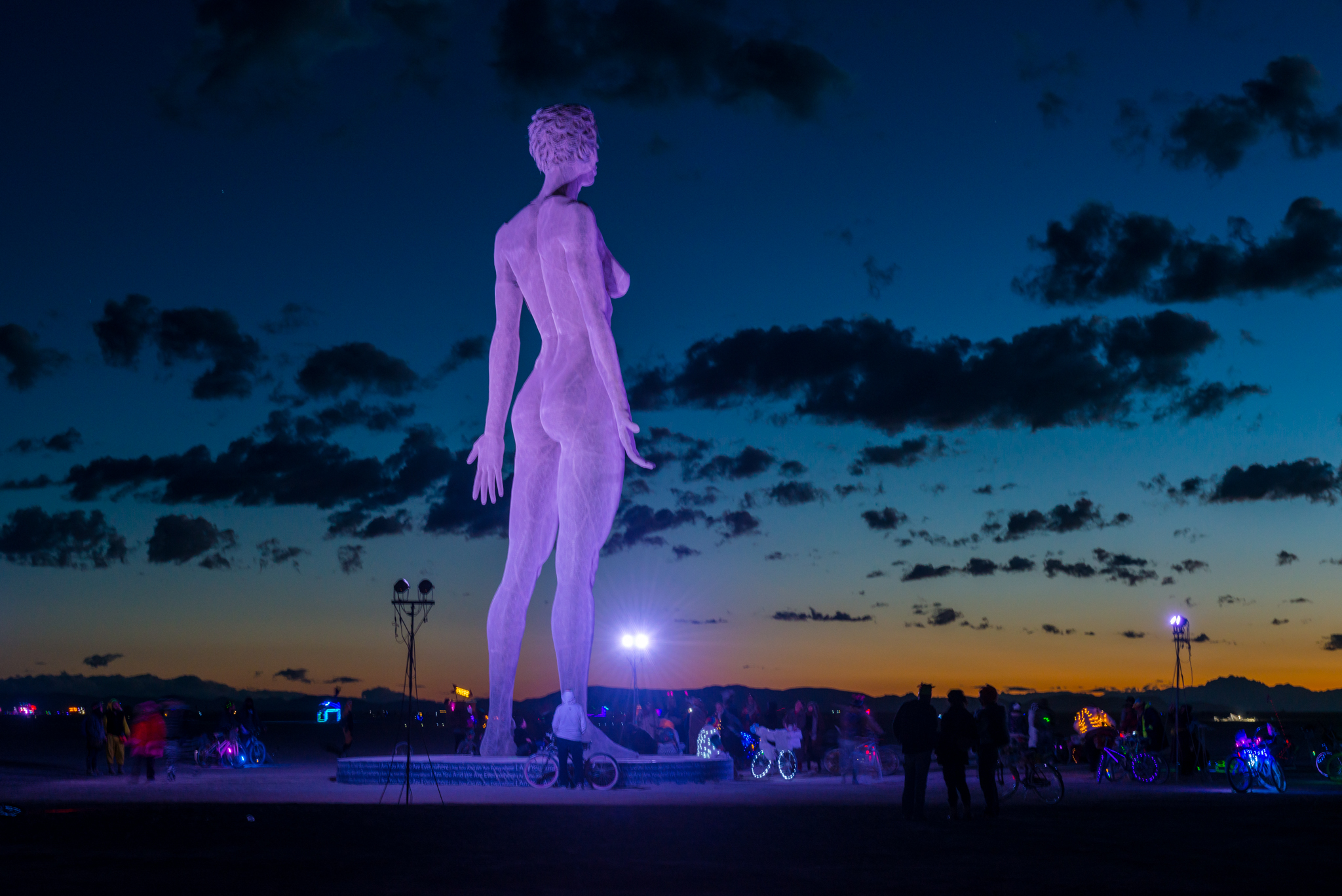 Night shot of a massive sculpture by Marco Cochrane nearing sunrise.